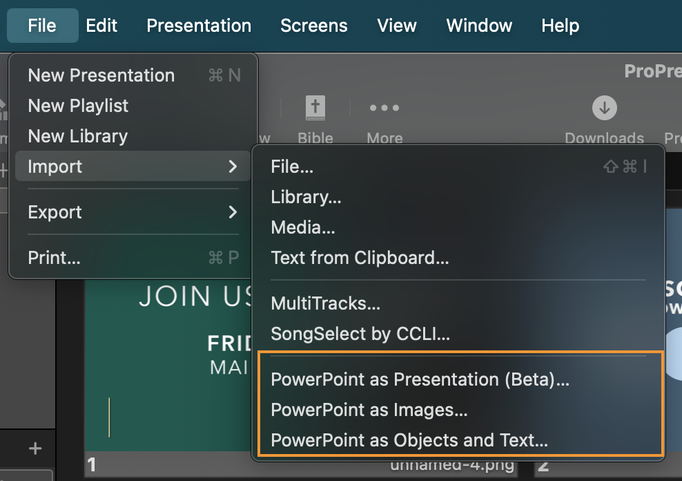 In order to import a PowerPoint file into ProPresenter, select File>Import from the menu bar. Then in the list of options, choose how you would like to import your presentation.